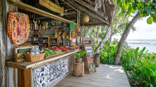 shop, beachfront, tropical, good, craft, local, souvenir, ocean, beach, store, stall, hand-made, artisan, market, display, product, wooden, counter, shelf, item, texture, colours, vibrant, natural, rustic, exotic, culture, heritage, textile, jewellery, accessory, produce, vegetable, fruit, basket, seashell, decor, design, artwork