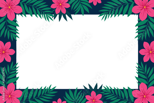 Tropical floral frame with green leaves and pink flowers border design for invitations and cards