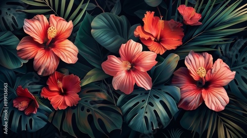 hibiscus, flower, tropical, leaf, green, pink, foliage, arrangement, floral, nature, pattern, design, exotic, bloom, flower petals, jungle, paradise, summer, botanical, bright, high-coloured, beauty, illustration, art, plant, flora, background, wallpaper, dark, lush, vibrant, colourful, detailed, realistic, texture, monochromatic, contrast