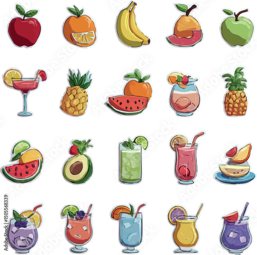 tropical, fruit, drink, sticker, pineapple, watermelon, banana, juice, cocktail, summer, healthy, menu, decor, vector, design, colourful, isolated, beverage, art, cardboard box, set