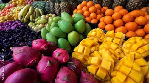 Tropical fruits variety including dragonfruit oranges and grapes arranged on colorful food market table