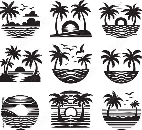 tropical, island, beach, summer, palm, tree, icon, set, vector, illustration, sea, sun, vacation, travel, nature, ocean, holiday, silhouette, water, coconut, sky, design, landscape, wave, sunset, paradise, resort, sunny, exotic, coast, shore, sand, leisure, tour tourism, relaxation, scenery, palm tree, tropics, warm, sunshine, destination, peaceful, breeze, natural