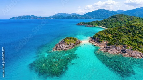 Tropical island nature concept. Aerial view of a stunning tropical coastline with turquoise waters and lush greenery.