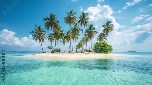 Tropical island paradise. Lush palm trees line a pristine, sandy beach, set in a turquoise sea under a bright blue sky with fluffy white clouds