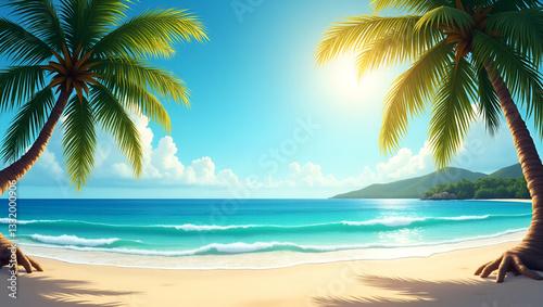 Tropical island seamless tile pattern with palm trees bright sun and sandy beaches concept as Palm trees bright sun and sandy beaches form a vibrant and tropical seamless tile pattern for a summer esc