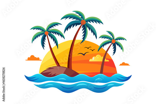 tropical, island, sunset, palm tree, ocean, sea, beach, vacation, summer, paradise, nature, landscape, travel, illustration, vector, art, design, sky, cloud, bird, water, wave, warm, evening, golden hour, serene, tranquil, exotic, holiday, get-away, scenic, vibrant, colourful, icon, graphic