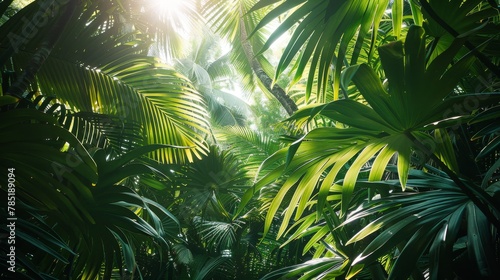 Tropical Leaves: A photo of a tropical rainforest with a canopy of large leafy trees