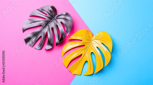 leaf, tropical, summer, background, pink, blue, design, monstera, yellow, black, vibrant, colours, decor, foliage, plant, nature, texture, pattern, illustration, graphic, image, photo, minimal, style, aesthetic, bright, creative, pastel, colourful, holiday, vacation, stylish, element, template, banner, poster