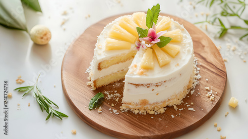 Tropical mousse cake with lychee and pineapple. Modern dessert