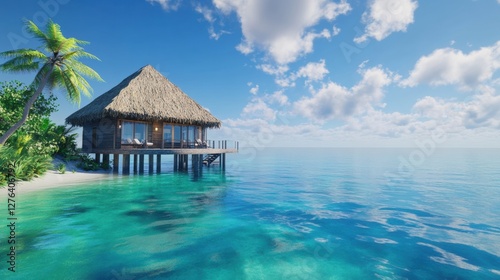 idylli, ocean, island, paradise, resort, tranquil, destination, relaxation, serene, get-away, vacation, tropical, calm, oasis, coastline, water, travel, horizon, bungalow, thatched, holiday, turquoise, beach, blue, landscape, architecture, nature, wooden, palm, luxurious, summer, clear, sky, sun, roof, sky, cloud, and, exterior, cloud, under, over, fluffy, white, tree