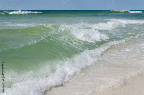 Tropical ocean beach landscape scene. Beautiful scenic tourist travel destination location. Relaxing Gulf Coast seaside beaches.