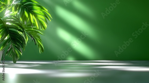 palm leaf, interior design, shadow play, green background, beam of light, design element, abstract background, window light, tranquil scene