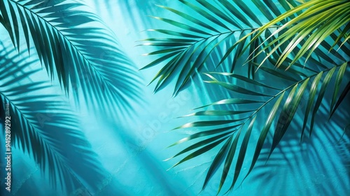 Tropical palm leaves casting shadows on a blue backdrop Minimalistic nature Summer theme Flatlay with space for text