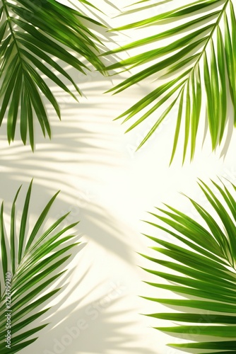 Tropical palm leaves casting shadows on a white surface creating a natural frame for text