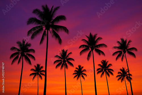 Tropical Palm Tree Silhouettes Against Vibrant Purple Orange Sunset Sky