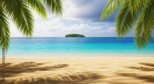 Tropical paradise beach scene with palm trees ocean horizon and distant island under cloudy sky