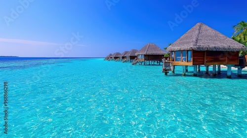 Tropical paradise featuring water bungalows over crystal clear turquoise water under a vibrant blue sky.