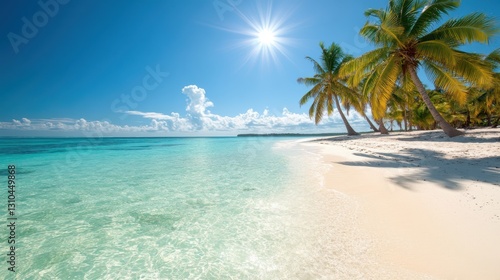 Tropical paradise with palm trees and pristine white sand under a radiant sun