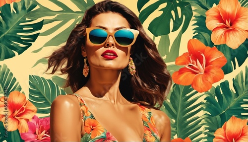 Tropical photo collage of beautiful woman in sunglasses with modernism-inspired portraiture