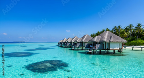 Tropical Resort Overwater Bungalows on Turquoise Ocean Under Blue Sky