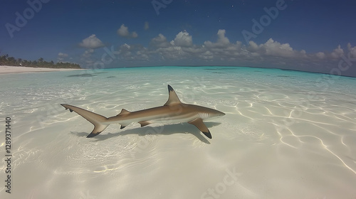 Tropical shark in shallow, clear turquoise water, beach and sky background