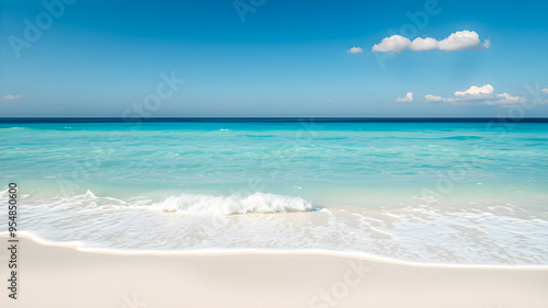Tropical sunny beach view. Calm sunshine relaxing empty beach scene, blue sky happy clouds white sand. Tranquil nature shore coast landscape. Seaside beachfront horizon seascape in sunlight. AI gen