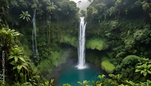 Tropical Waterfall Cascades into a Turquoise Pool in a Lush Jungle