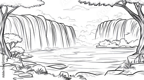 Tropical waterfall sketch, serene pool, lush foliage, coloring book