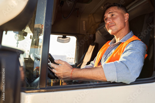 industry, ruck, camera, looking, mode, at, transportation, stop, only, manual, image, man, man, hauler, men at work, transport, driving, occupation, person, summer, brown, spring, of, smiling, expressing, male, colours, job, working, driver, truck, steering, sitting, 1, adult, wheel, hair, people, positivity, freight, inside, jacket