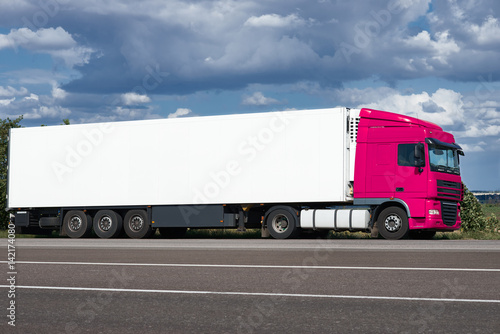 truck, cargo, transportation, white, container, road, pink, thoroughfare, way, clean, clear, object, copy space, blank space, 1, driveway, business, car, commercial, delivery, export, expressway, freight, good, heavy, logistic, expressway, trade, transport, trucking, nobody, day, carry, transfer, sky, cloud, drive, go, blank, empty, blue, tree, field, fast, asphalt, yellow, toned, lorry, detail, closeup