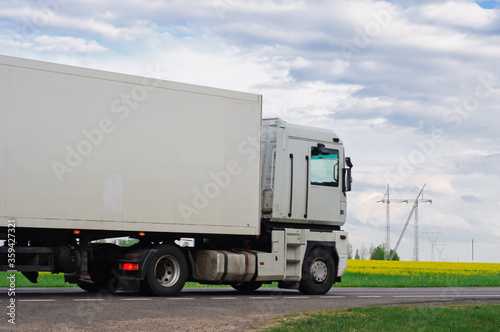 Truck with container on highway, cargo transportation concept. Shaving effect.