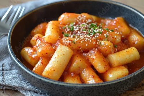 Tteokbokki a favored Korean treat consists of rice cake fish cake and sweet red chili sauce