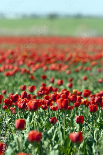 flower, tulip, grow, field, earth, stalk, colours, red, green, blue, sky, tree, flower petals, bud, spring, blossom, nature, landscape