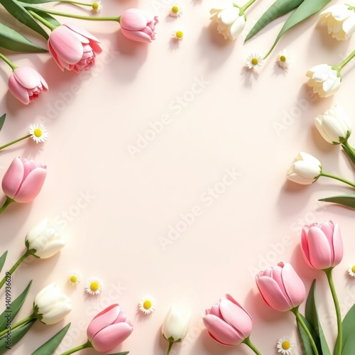 Tulips and daisies arranged around a soft pink background. Light floral flatlay perfect for spring-themed cards, wedding invitations, and branding.