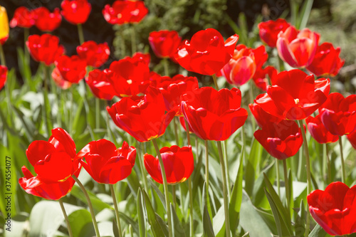 tulips flower, many flowering tulips on a flower bed Can be used for display or montage your production. Presentation of advertising ideas.