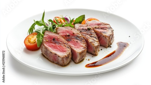 Tuna and veal gourmet dish beautifully plated with cherry tomatoes and fresh greens on a white background top view
