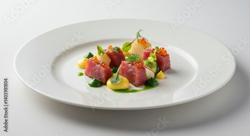tuna, fish, cube, fruit, herb, plate, white, food, meal, dish, cookery, culinary, epicure, eatery, fresh, healthy, avocado, mango, elegant, presentation, delicious, fine dining, ingredient, raw, seafood, gastronomy, culinary arts, studio shot, nobody, nourishment, diet, balanced, light, bright, closeup, topview