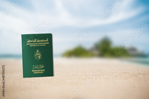 Tunisian passport on the sand of the beach, the Tunisian passport is issued to citizens of Tunisia for international travel.