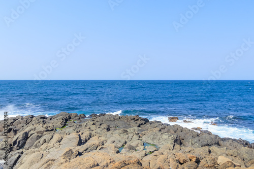 sea, cape, rock, rock, horizon, tour tourism, spot, coastline, tourist attraction, showplace, japan, landscape, beach, view, landscape, scene, beach, wave, clean, lovely, transparent, sky, blue skies, copy space, space, sunny, blue, nature, immensity, grandiose, island