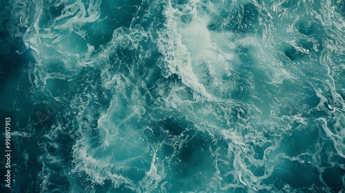 Turbulent ocean waters captured in dynamic motion, highlighting the contrasting hues of teal and white foam.
