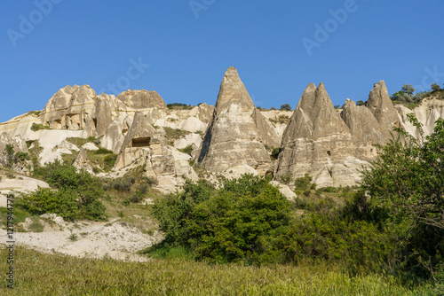rock, formation, cappadocia, turkey, landscape, nature, erosion, geology, tour tourism, travel, scenery, iconic, stone, cliff, hill, sunlight, outdoors, adventure, hiking, trail, photo, historic, unique, landmark, environment, panoramic, wilderness, serenity, exploration, culture, vacation, heritage, trekking, earth, sky, flora, vegetation, sandstone