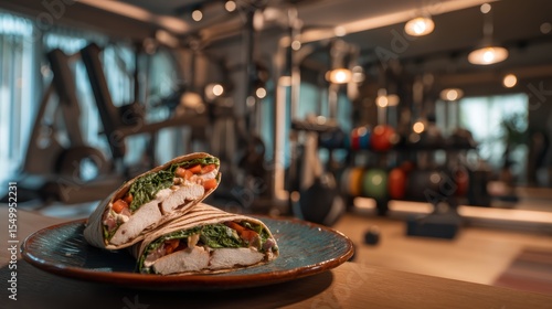 Turkey and spinach wrap on a ceramic plate on a softly blurred fitness trainer’s studio backdrop