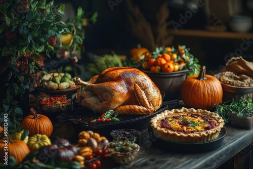 turkey grill, pie, pumpkin, cornucopia , decorate on dark natural wood table, backgroud is interior of house style country, still life food
