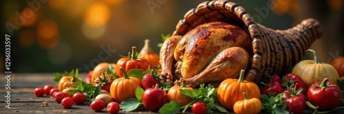 Turkey in a cornucopia filled with seasonal fruits and vegetables, autumn, leafy greens, cornucopia