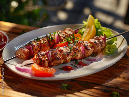 Turkey kebab on a plate, served on a wooden table. Bright morning light.