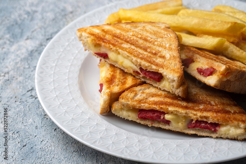 Turkish toast, mixed toast with cheddar cheese, sausage and ham, with fried potatoes (Turkish name; Karisik tost)