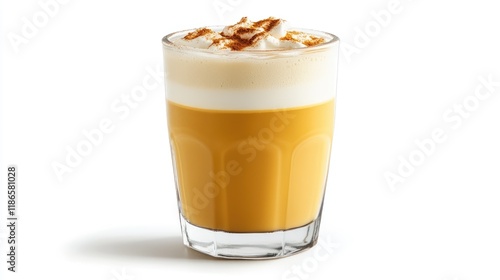 Turmeric Latte with Creamy Foam in Transparent Glass on White Background