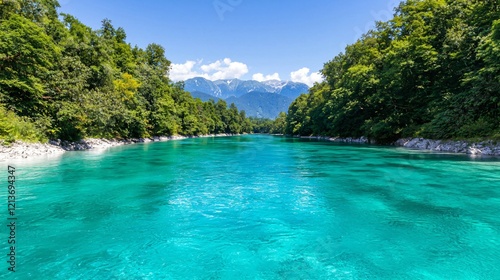 Turquoise river flows through lush green valley, mountains in background. Ideal for travel brochures