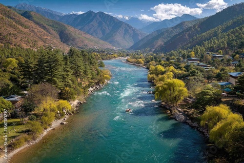 river, bhutan, vale, mountain, cloud, scenic, turquoise, water, green, tree, forest, sunlight, kayak, tour tourism, nature, landscape, travel, aerial, view, tranquil, serenity, adventure, exploration, charming, village, house, autumn, colours, clear, calm, stunning, picturesque, huge, expansive, elevated, explore, dramatic, vibrant, gorgeous, peaceful, relaxing, photo, image