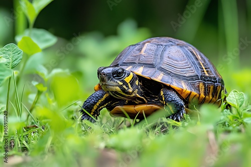 Turtle moving through the grasslands, blending in with the foliage as it slowly navigates its way home